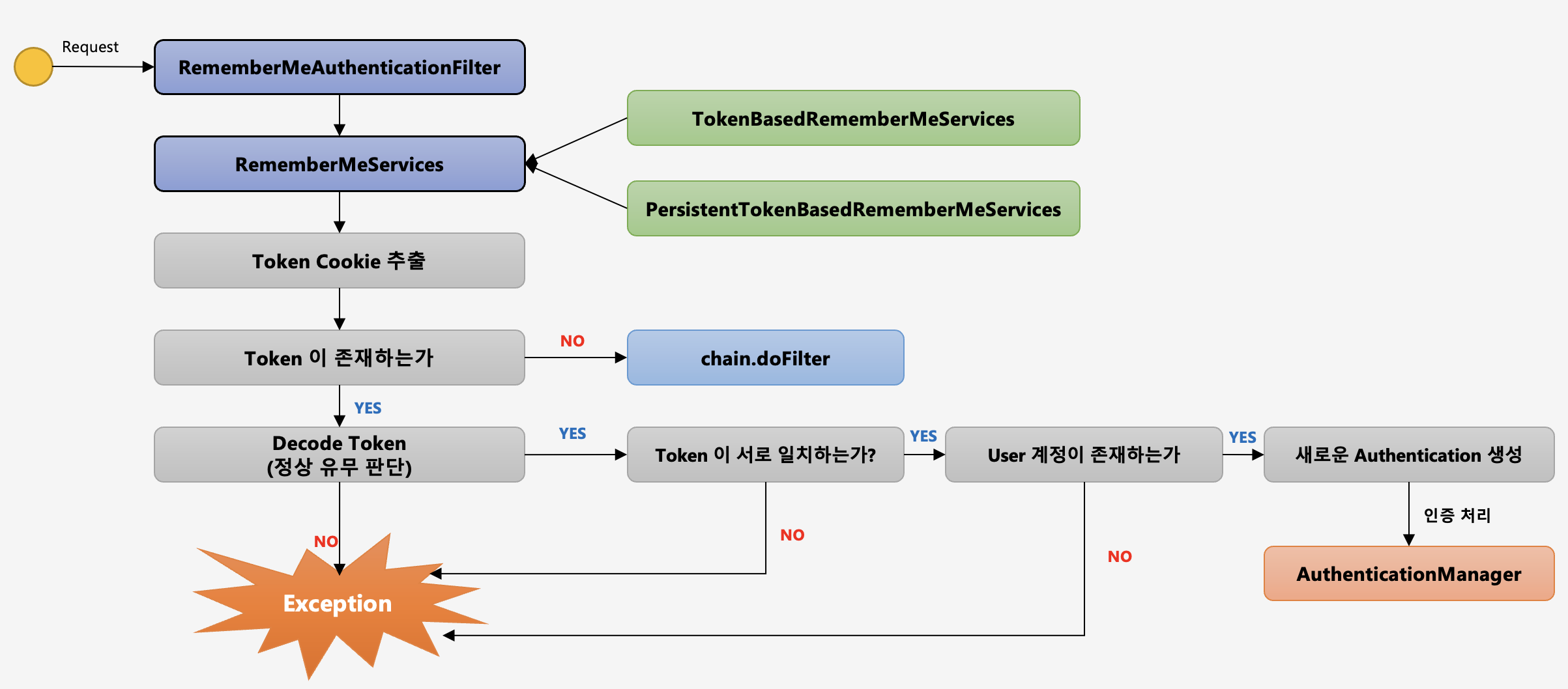 - 실제 사용자 인증은 RememberMeServices 인터페이스 구현체를 통해 처리된다.