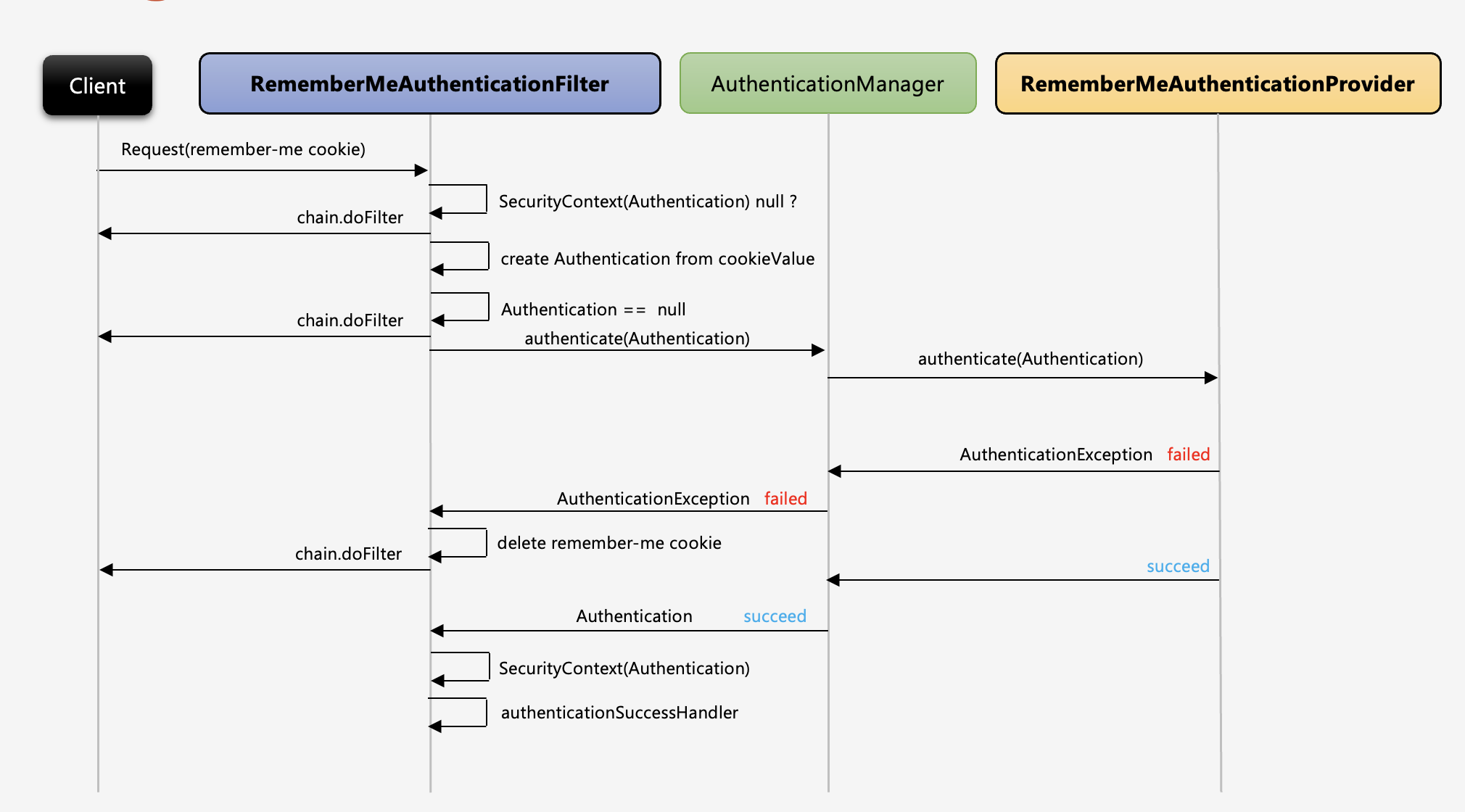 - 인증되지 않은 사용자의 HTTP 요청이 remember-me 쿠키(Cookie)를 갖고 있다면, 사용자를 자동으로 인증처리한다