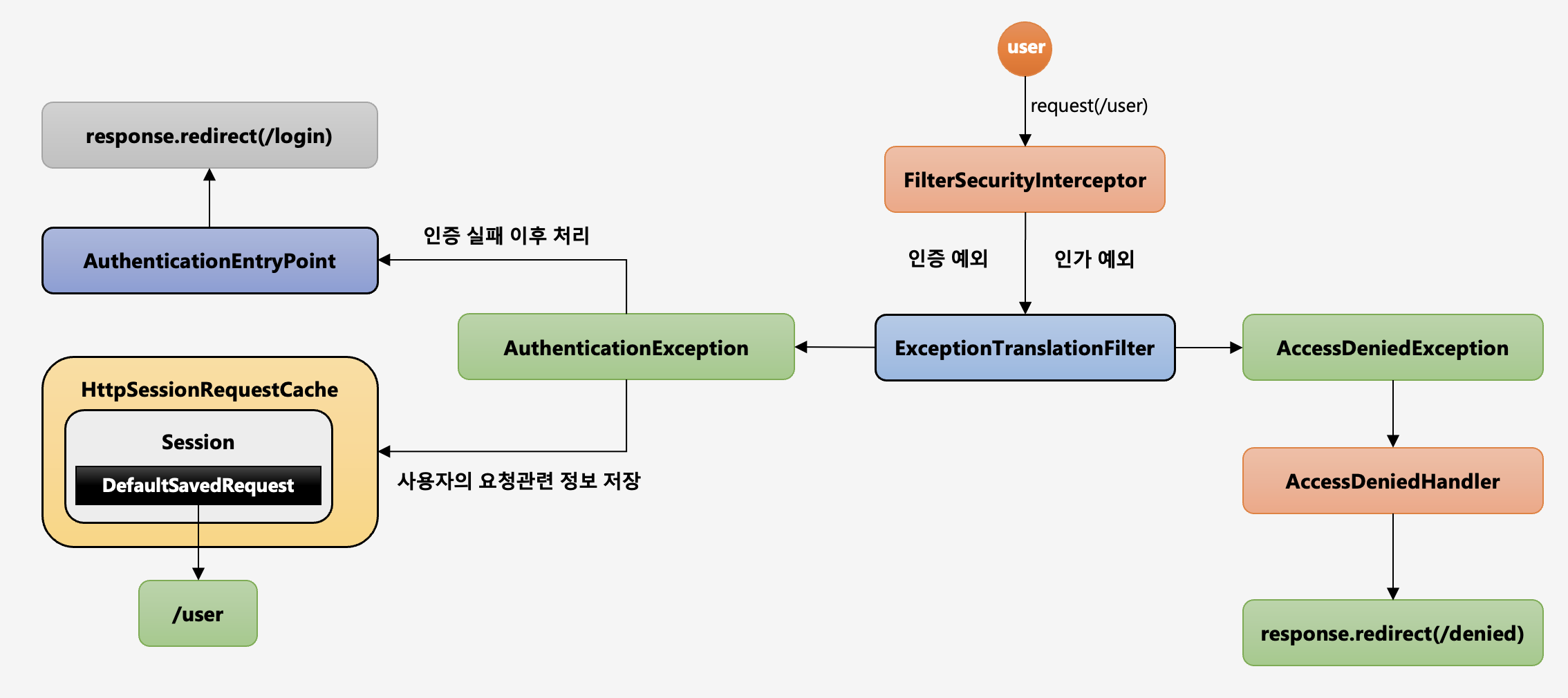 - 즉 아무것도 안건드린 default 필터 순서 상에서는, FilterSecurityInterceptor에서 발생하는 에외들만 처리 가능.