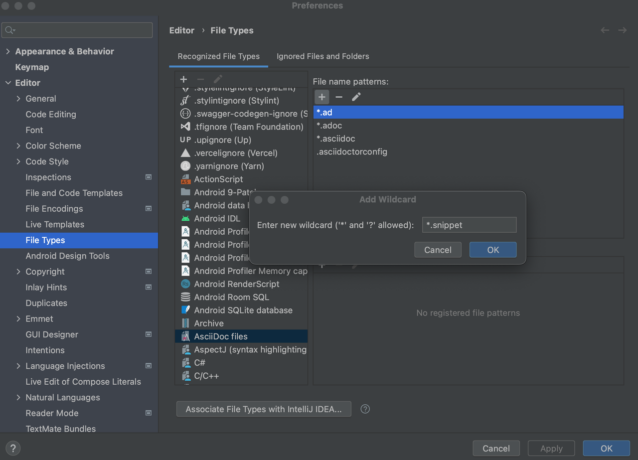 Recognized File Types 에서 마우스 조금 내리다보면 AsciiDoc files보인다.
