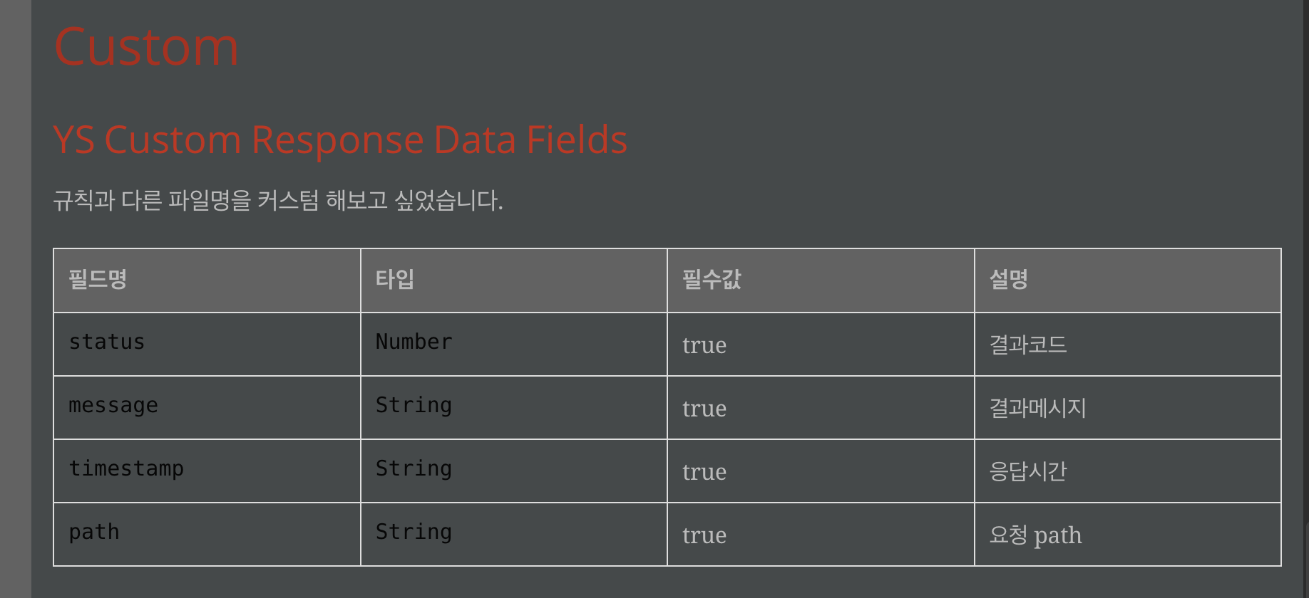 - 필드명, 타입, 필수값여부, 설명 정도만 추가하였다.