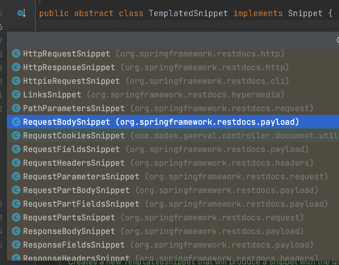 document(String identifier, Snippet... snippets)identfier: 문서화 할 snippet 파일 이름Snippet: 문서화 할 문서 조각. Snippet 인터페이스를 구현하고 TemplatedSnippet 추상 클래스를 상속받은 여러 클래스들RequestFieldSnippet.class: 요청 필드 문서화시 사용. 보통 static method인 requestFields() 메소드 사용하여 문서화.ResponseFieldsSnippet.class: 응답 필드 문서화시 사용. 보통 static method인 responseFields() 메소드 사용하여 문서화.