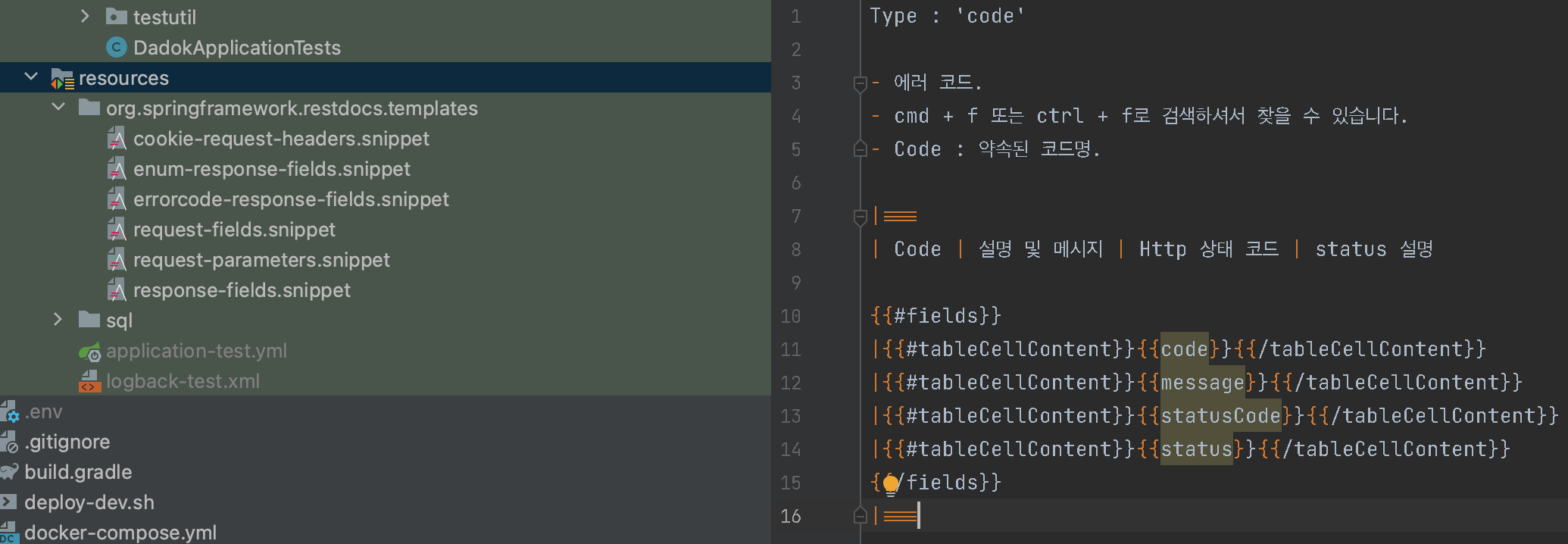 - Custom Snippet 파일과, Custom Sinppet 클래스 : ErrorCodeEnum은 HttpStatus, code, message 필드로 구성되어있으며 이런 Snippet은 지원하지 않는다. 때문에 Snippet 문서와 클래스가 따로 필요하다.