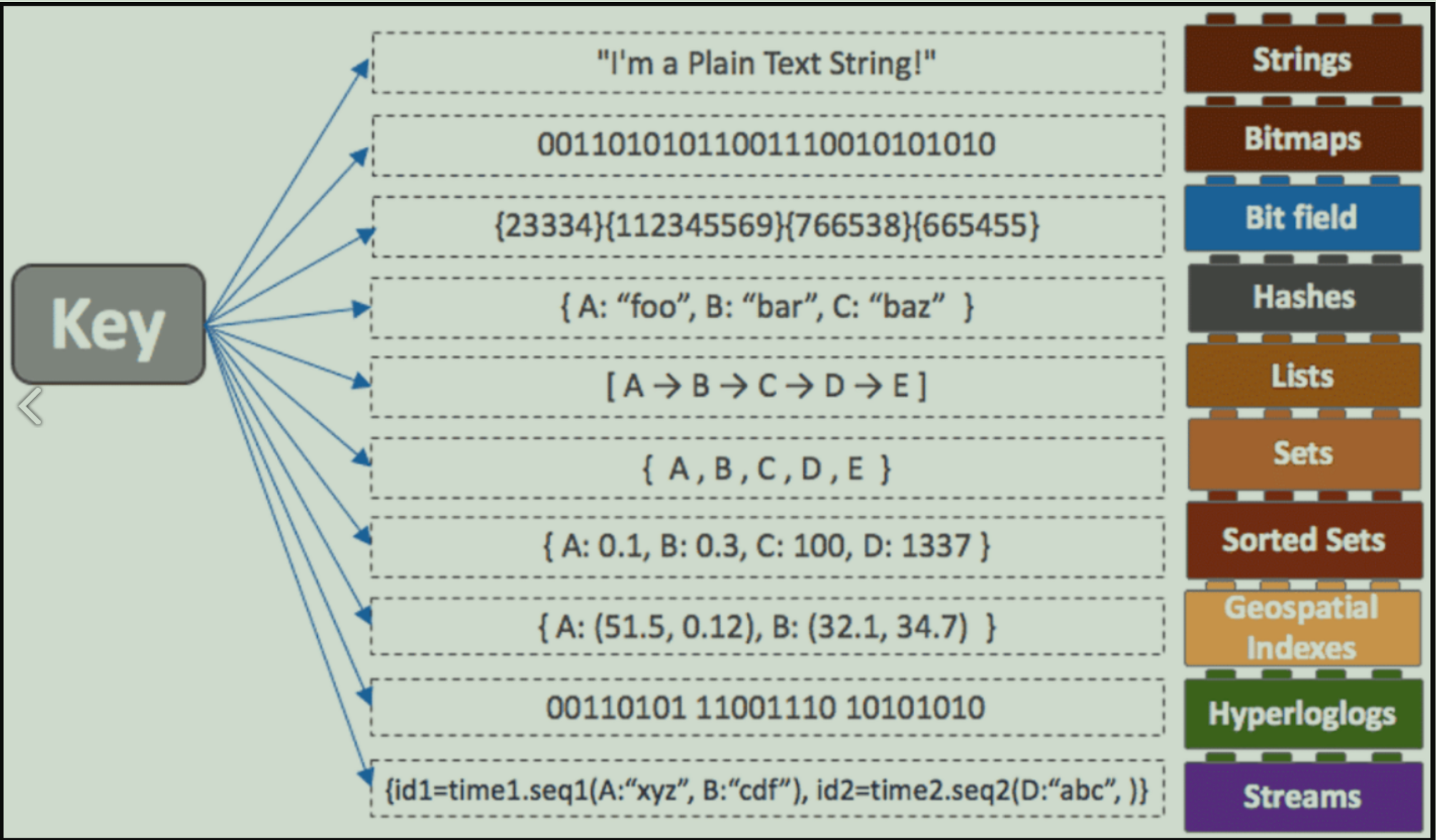 String, Bitmap, Hash, List, Set, Sorted Set, Geospatial Index, Hyperloglog, Stream