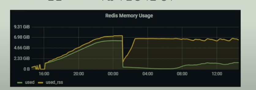 -> 단편화가 많이 발생시 activedefrag 옵션을 활용하자. - 특정 시점에 피크를 찍고 다시 삭제되는 경우