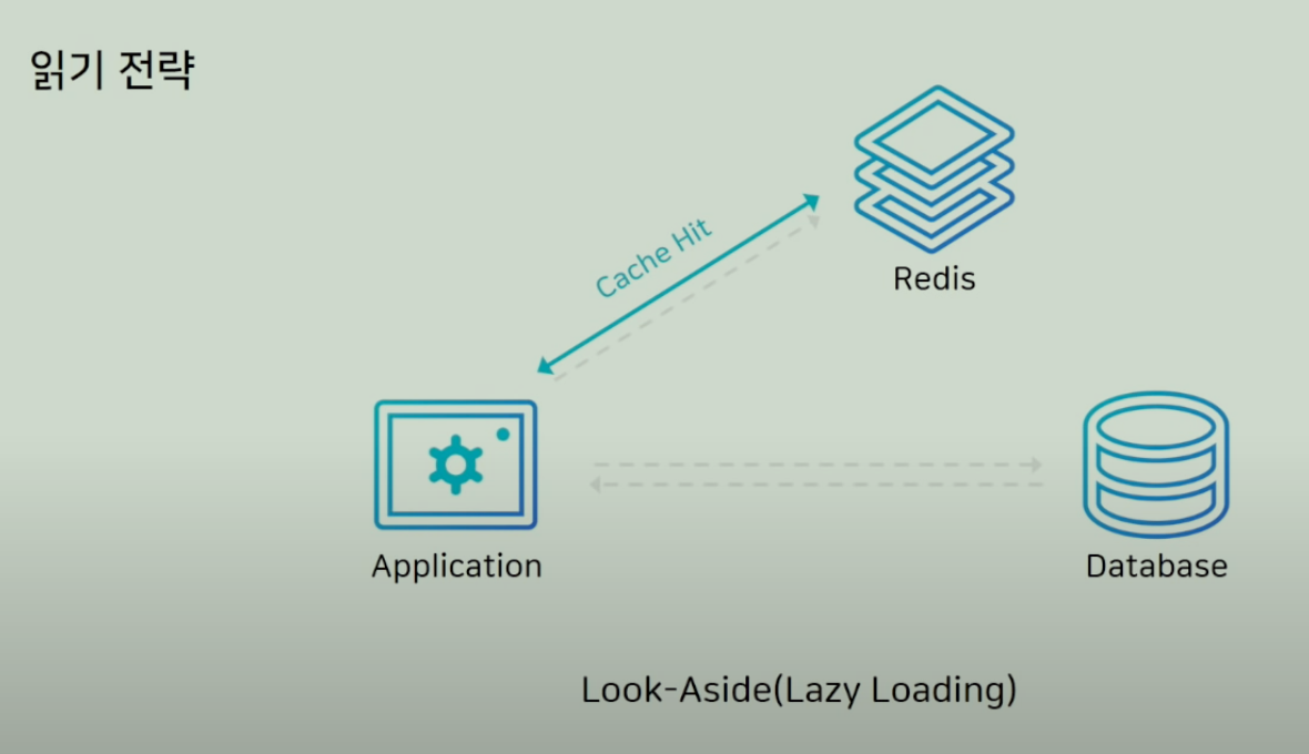 - 애플리케이션은 캐시를 먼저 조회해서 캐시에 데이터가 있으면 반환, 없으면 DB에 접근해서 조회