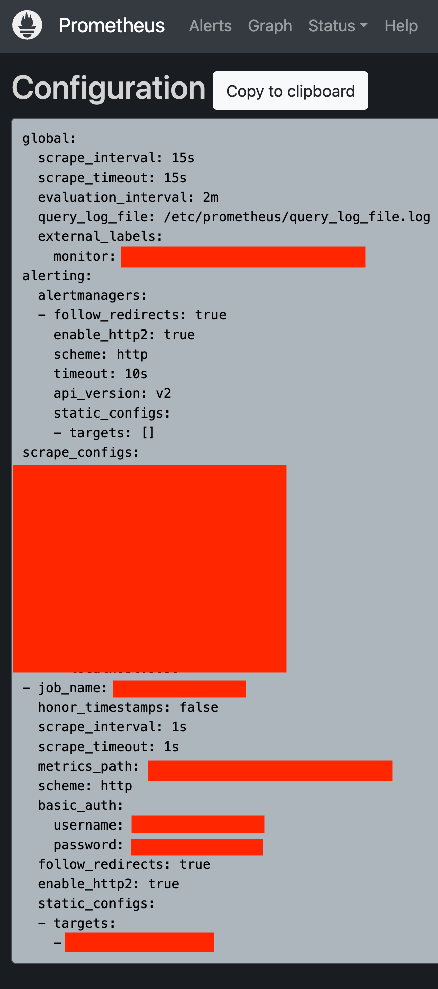 - 보안을 위해 민감한 정보는 다 가렸으며, prometheus.yml에 작성한 내용들입니다.