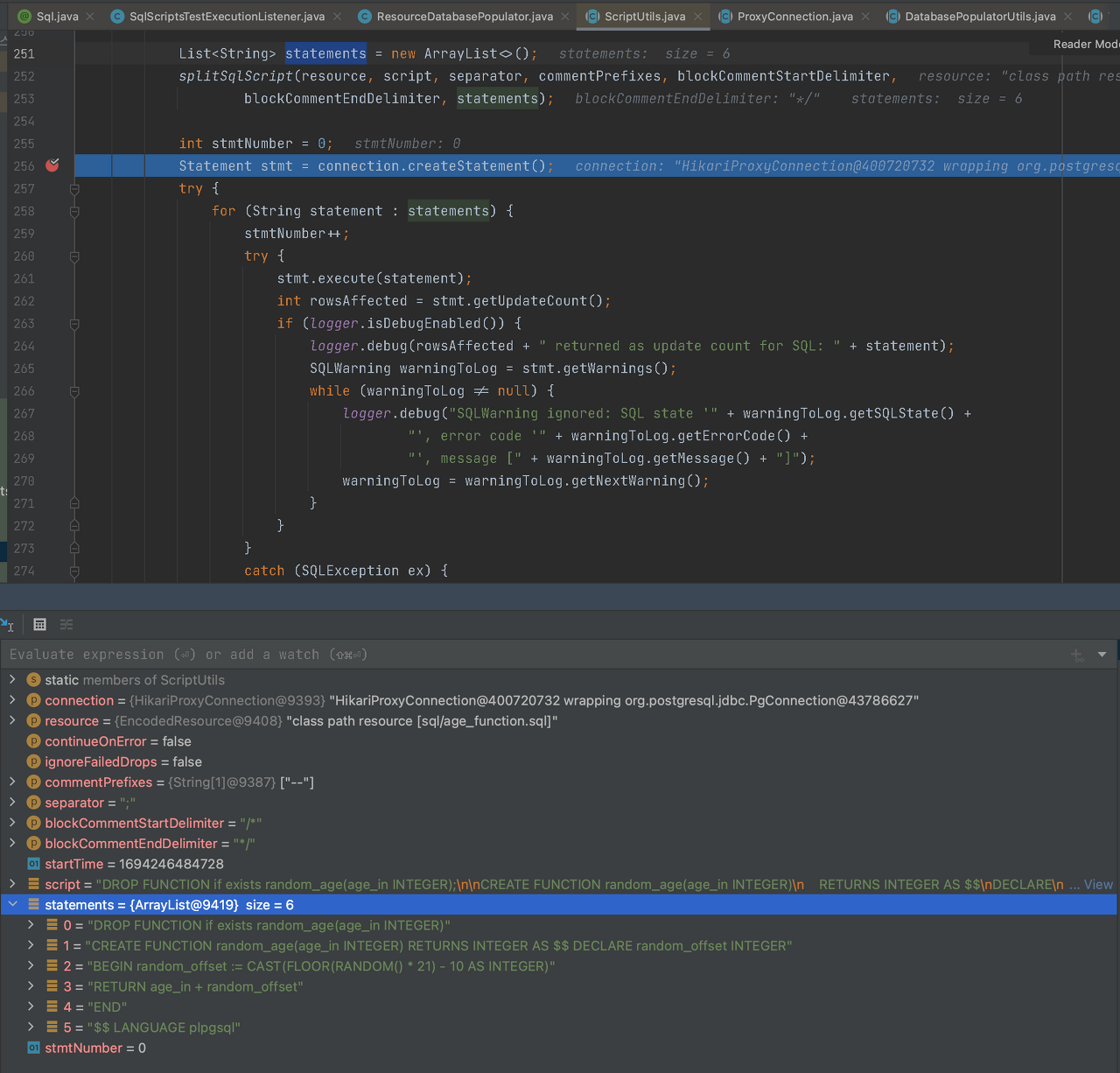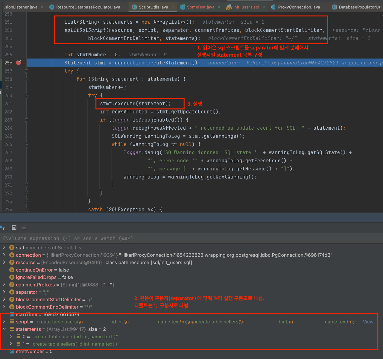 org.springframework.jdbc.datasource.init.ScriptUtils에서 executeSqlScript()메소드가 구문을 분석하고 SQL을 파싱하는 과정에서