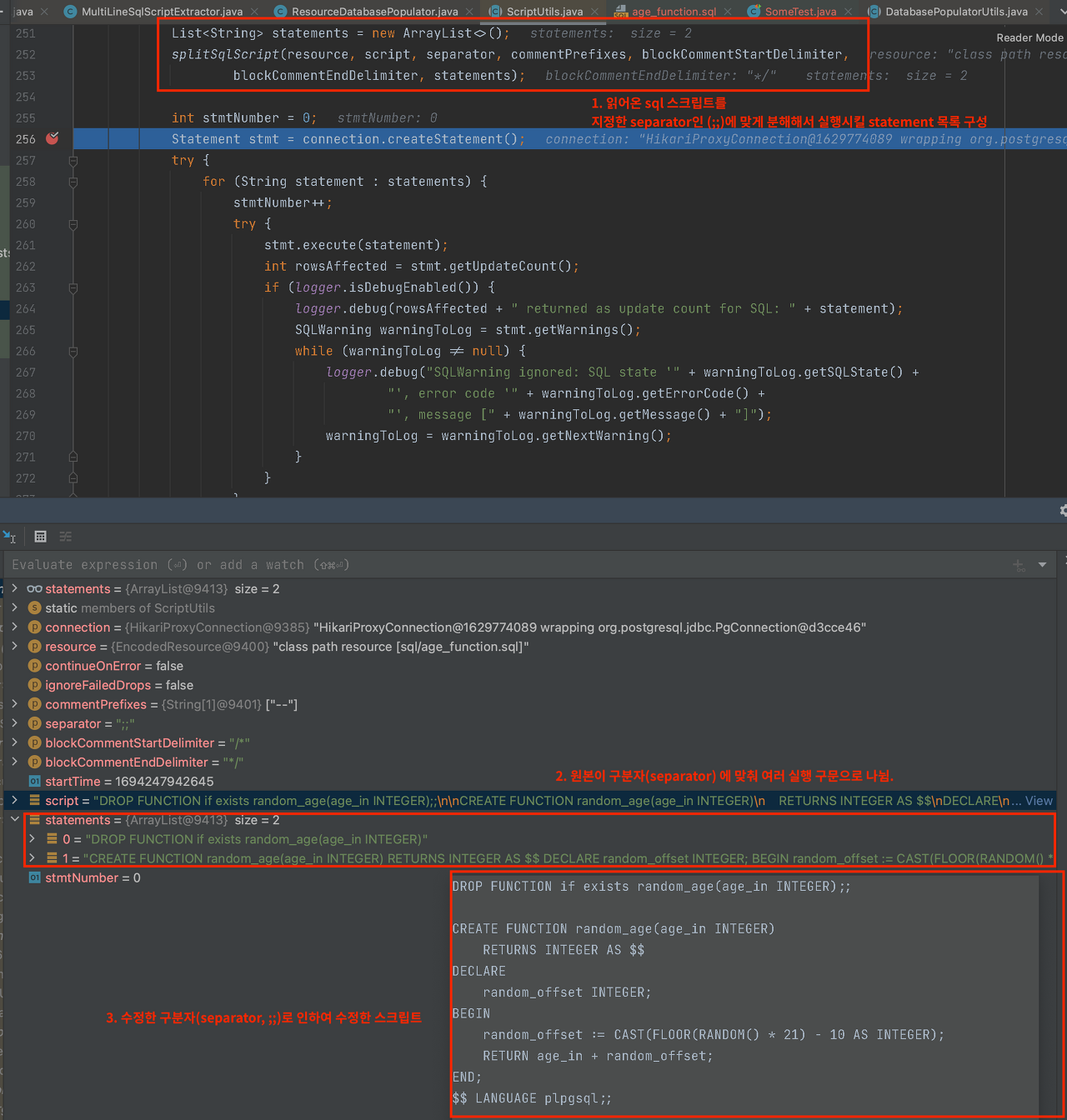 이렇게 지정하면, ResourceDatabasePopulator에서 주입받아서 ScriptUtils에게 구문 분석시 지정한 separator를 넘겨주게 됩니다.