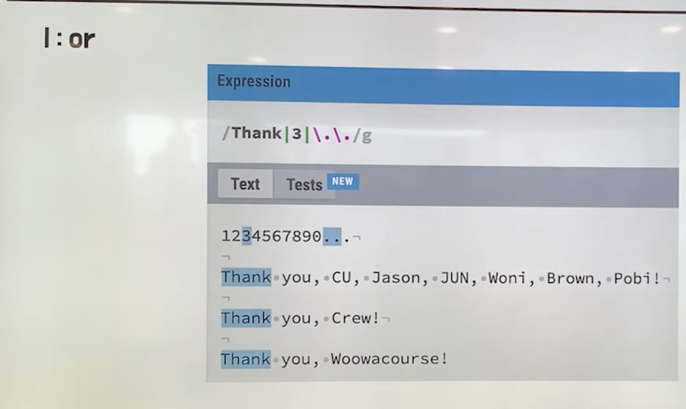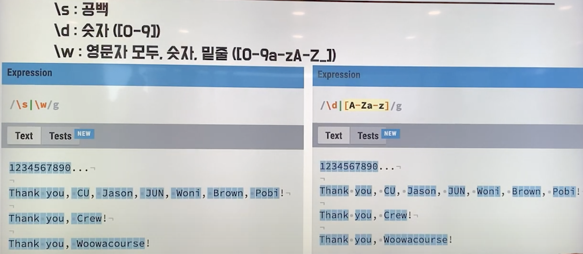 - \s (공백) | (또는) \w (영문자 모두, 숫자, 밑줄)을 찾는다