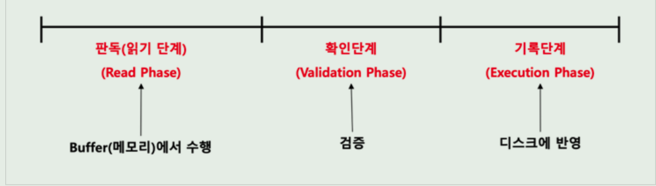 [처리단계] 판독 → 확인 → 실행(기록/철회) - 판독(Read phase, R) : 트랜잭션의 모든 갱신은 사본에 대해서만 수행, 실제 DB에 대해서 수행하지 않음 - 확인(Validation phase, V) : 판독단계에서 사본에 반영된 트랜잭션의 실행결과를 DB 반영전 직렬 가능성의 위반여부를 확인 - 기록(Write phase, W) : 확인 통과시 실행결과를 DB에 반영, 실패시 결과 취소후 트랜잭션 복귀