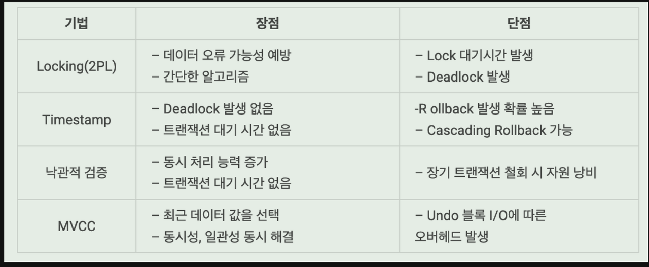 1. Locking : 하나의 트랜잭션이 실행하는 동안 특정 데이터항목에 대해서 다른 트랜잭션이 동시에 접근하지 못하도록 하는 기능을 제공하는 기법
