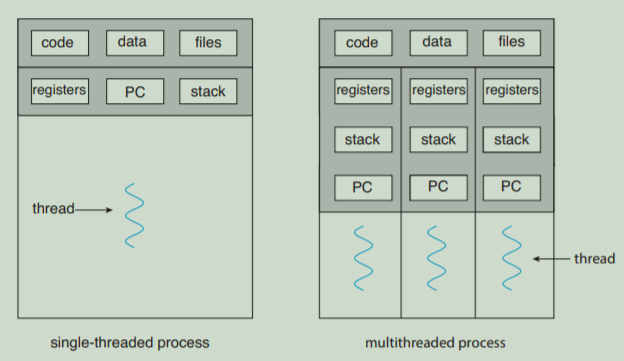 - 한 프로세스 내에 여러 스레드가 존재할 수 있다.