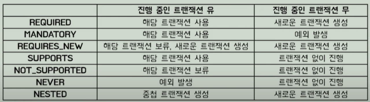 - 진행 중인 트랜잭션이 존재하면 기존 트랜잭션을 일시 중지하고 새로운 트랜잭션을 시작한다.