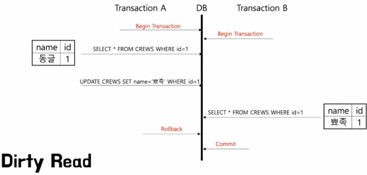 - 더티페이지(메모리에는 변경이 되었지만 디스크에는 아직 변경이 되지 않은 데이터)에 있는 데이터를 검색한다. 커밋되지 않은 데이터를 리드하기 때문에 더티리드 후 더티페이지가 롤백이 되면 잘못된 데이터를 읽어온 경우가 되어버린다.