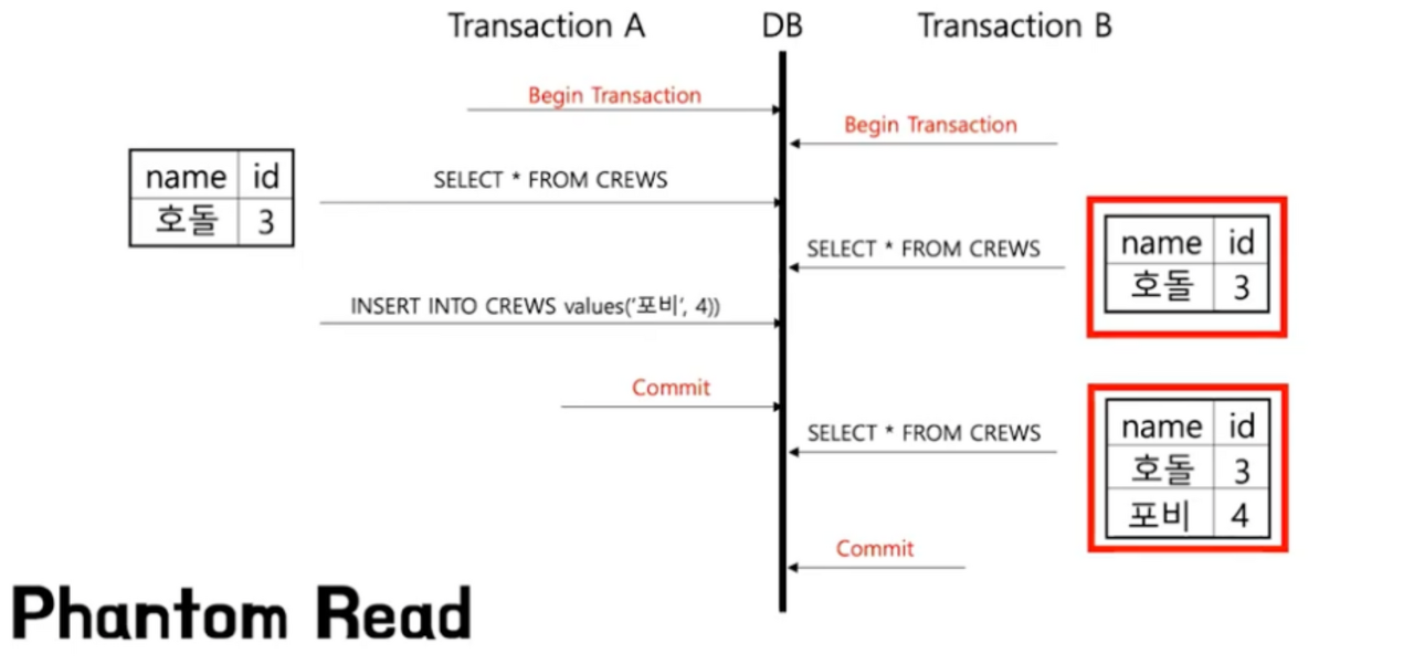 - 한 트랜잭션내에서 동일한 쿼리를 두 번 수행했는데, 첫 번째 쿼리에서 존재하지 않던 유령(Phantom) 레코드가 두 번째 쿼리에서 나타나는 현상