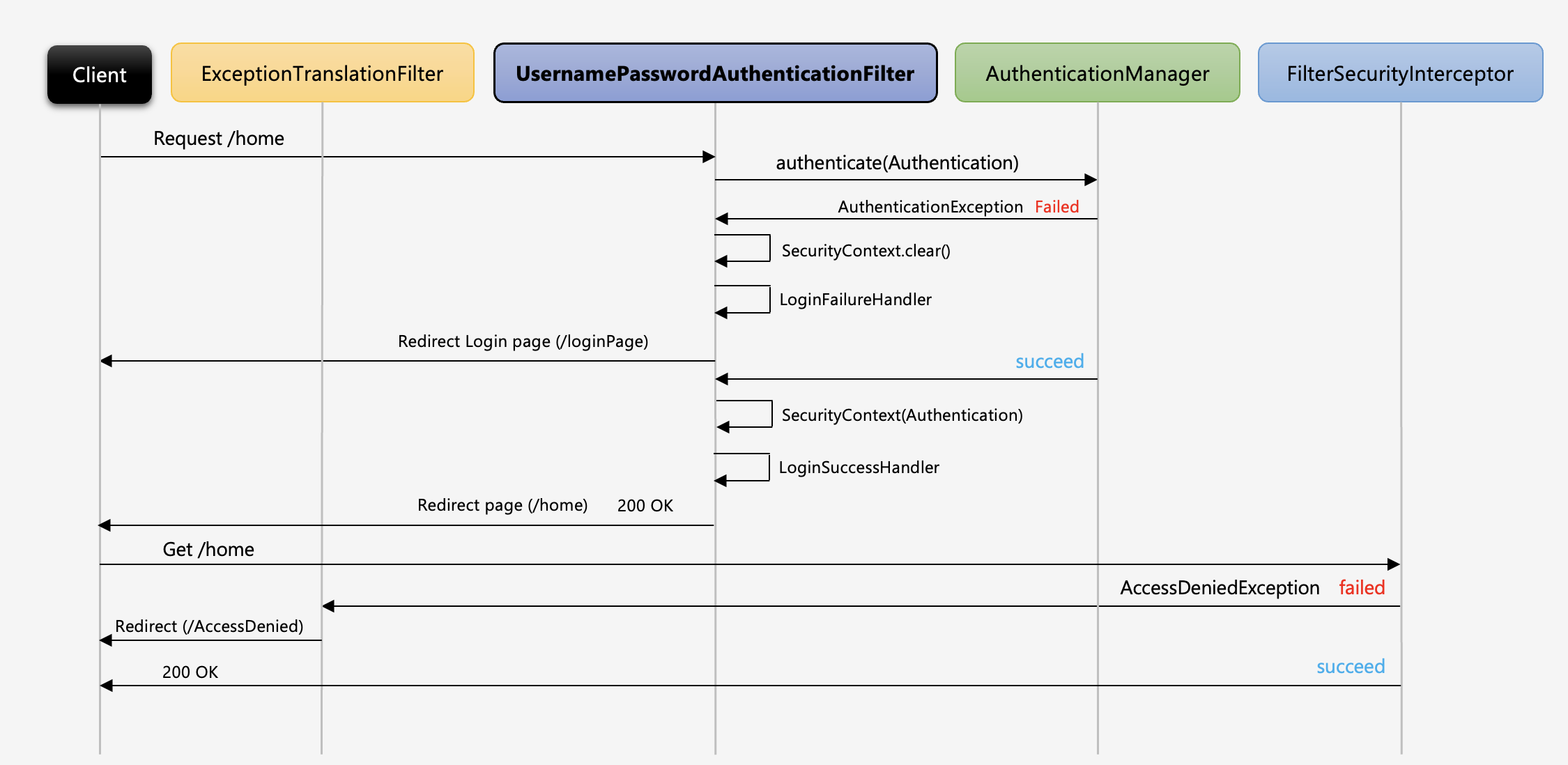 - AuthenticationSuccessHandler를 실행하여 리다이렉트 한다. 보통 로그인 페이지로 리다이렉트 할때는 SimpelUrlAuthenticationHandler가 ExceptionTranslationFilter에 저장된 요청으로 리다이렉트 한다.